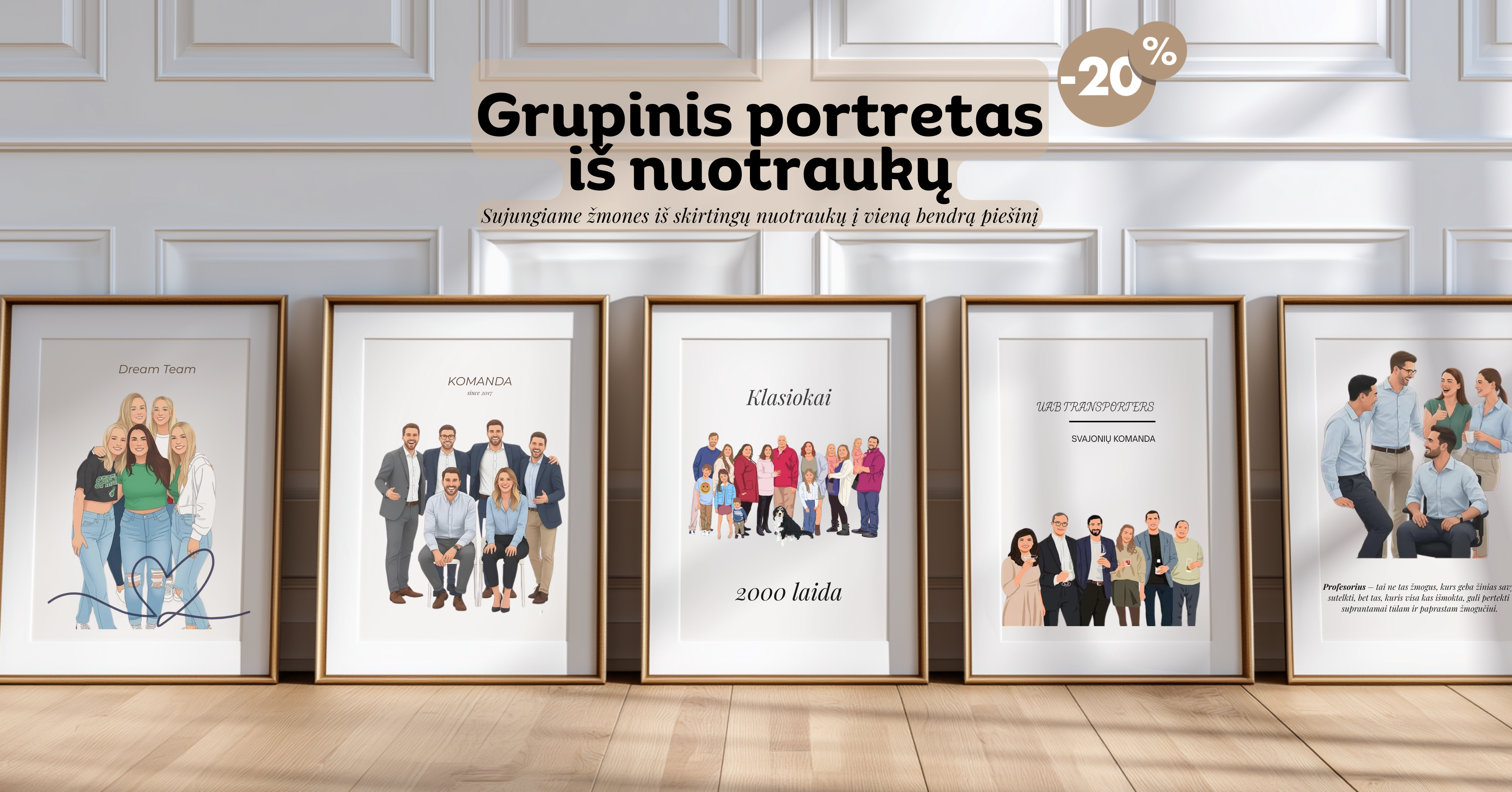 Piešiama kruopščiai pagal kiekvieną nuotrauką, išlaikant panašumą. Portretai atrodo tvarkingi, švarūs ir profesionalūs – tinka dovanoms, komandoms ir progoms.